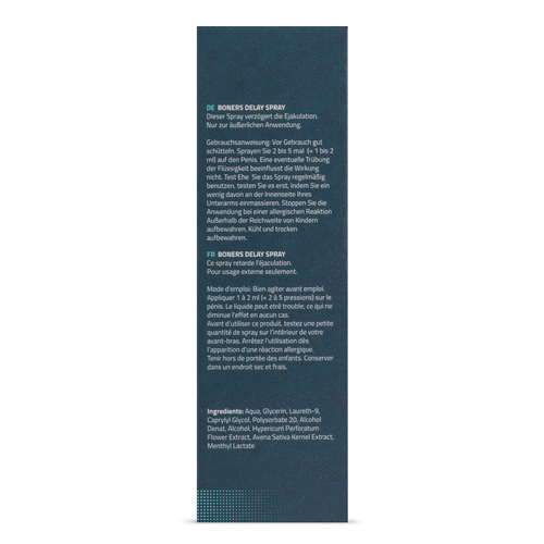 Boners Delay Spray verzögert Ihren Orgasmus, damit Sie länger aushalten können. Es hilft bei Überempfindlichkeit und kann Enttäuschungen im Schlafzimmer verhindern. Die kleine Flasche hat eine perfekte Größe für Ihren Nachttisch. Die Sprühkappe erleichtert das Auftragen des Sprays. Wie sie es verwenden: Schütteln Sie die Flasche vor Gebrauch und sprühen 2 bis 5 Mal auf Ihren Penis. Testen Sie vor dem Gebrauch etwas Spray auf Ihrem Arm. Sofort die Verwendung dieses Sprays stoppen, wenn Reizungen oder allergische Reaktionen auftreten. Inhaltsstoffe: Wasser, Glycerin, Laureth-9, Caprylyl Glycol, Polysorbat 20, Alkohol denat., Alkohol, Hypericum perforatum, Blütenextrakt, Haferkernextrakt, Menthyllactat