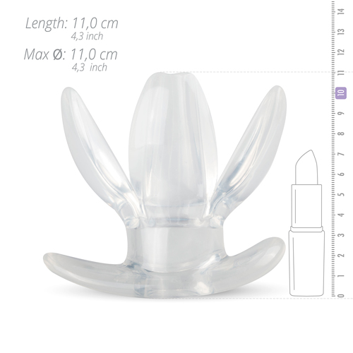 Dieser scharfe Clawed Analplug ist ein einzigartiges Analtoy, weil es sich ausdehnt sobald es eingeführt wird. Drücken Sie alle vier Keile für ein handhabbares Einführen zusammen. Einmal an Ihrem Sphinkter vorbei wird sich dieser einzigartige Stöpsel ausdehnen und öffnet Ihr Innerstes! Das transparente Material und eine Öffnung an der Basis des Plugs ermöglicht es Ihrem Partner, in Ihren Anus zu schauen oder Sie sogar mit einem Dildo, einem Einlauf usw. auszufüllen. Das phthalatfreie Material ist fest und dennoch flexibel und drückt in Ihnen gegen alle richtige Punkte. Genießen Sie ihn mit Silikon oder Wasser basiertem Gleitgel und reinigen ihn mit milder Seife oder Sexspielzeugreiniger und warmem Wasser.