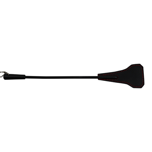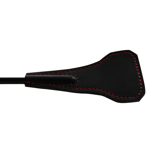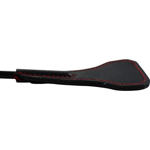 Kleine schwarze Gerte mit Schlagpaddel. Eine Seite mit Lederoberfläche, die andere mit Kunstfell. Nähte in Rot. Gesamtlänge 25 cm. Material: Spaltleder, 100% Polyester (Kunstfell).