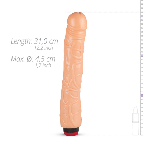 Stramme 31 cm lang (!) und satte 4,5 cm im Ø. Dazu prall geädert, mit ausgeprägter Gefühls-Eichel; jeder Lustnerv wird in erregendes Orgasmus-Zittern versetzt! Gleitfreudiges Soft-Material. Action-Vibration stufenlos regulierbar. Den geben Sie nicht wieder her!